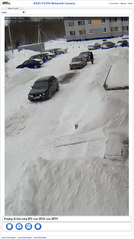 Веб интерфейс для пользователей. Можно заметить выбор профиля в котором можно выбрать размер и качество видеопотока предустановленного администратором. А так же в низу изображения есть управляемые элементы такие как "остановить картинку", "сфотографировать","развернуть на весть экран", "записать видео". Ниже этого дополнительные ссылки которые можно привязать к другим камерам или сайтам.