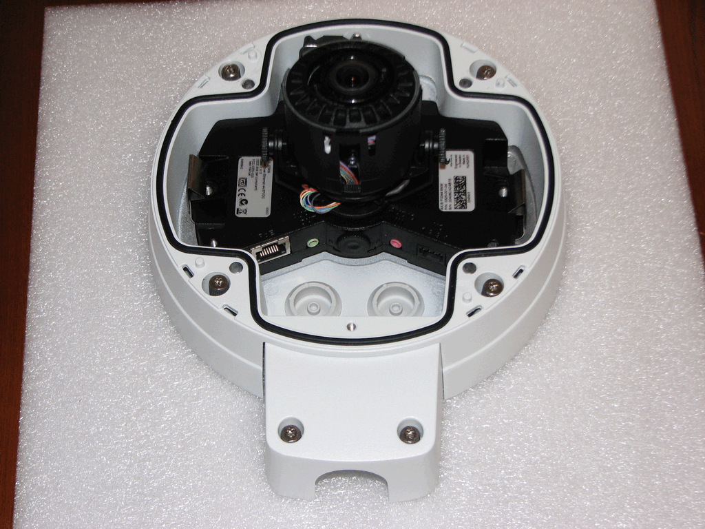 Низ камеры с удаленным монтажным диском, как мы видим можно подвести кабель через четыре входа. А так же можно убрать квадратный аппендикс если кабели будут подходить в камеру прямиком через стену.